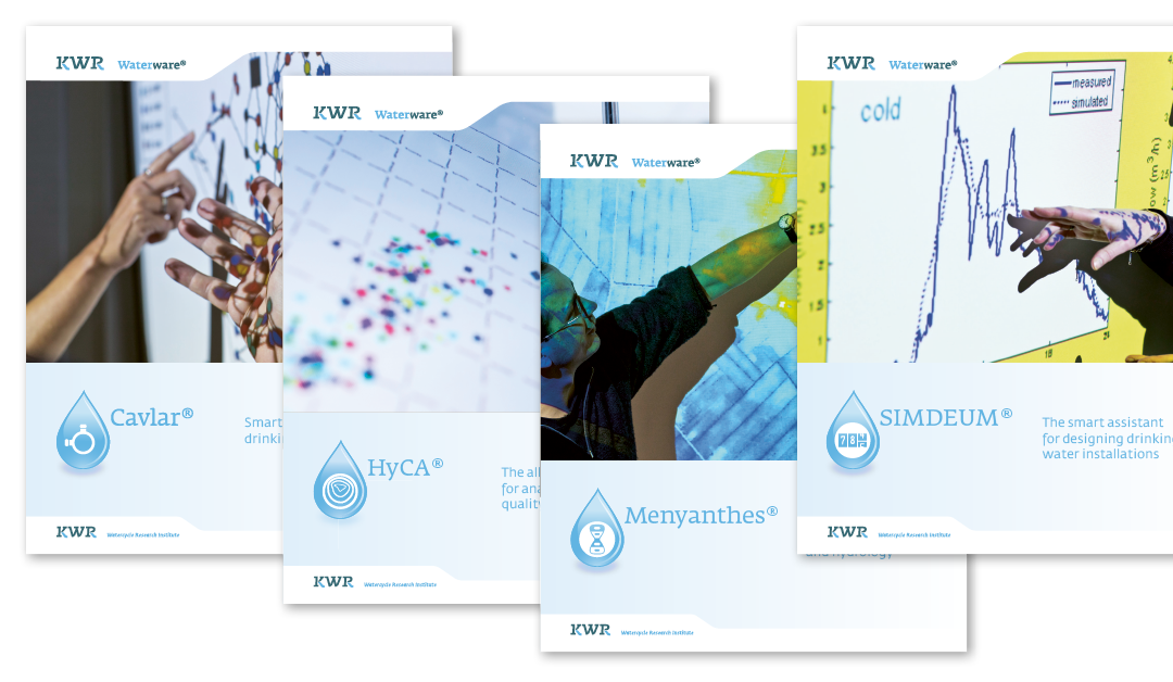 KWR onderzoekt vanuit de vier onderzoeksgebieden: gezond, duurzaam, vooruitstrevend en efficiënt water. Dit onderzoek resulteert regelmatig in proof-of-concept software. Deze software wordt verder ontwikkeld tot bruikbare software tools. Deze tools zijn ondergebracht onder de merknaam KWR Waterware®. De zes producten van KWR Waterware® zijn:
