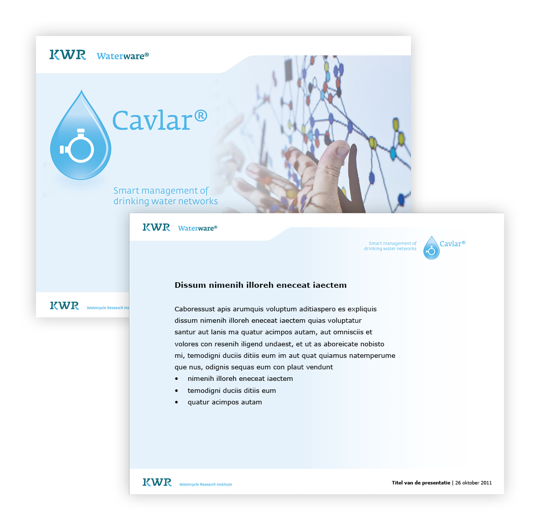 Om een eenduidige opzet te garanderen voor de presentaties van KWR Waterware® kun je een PowerPoint template gebruiken. Voor een aantal producten is een standaardopzet gemaakt. Er is een introductiescherm en een algemene tekstpagina waar je mee verder kan werken.
